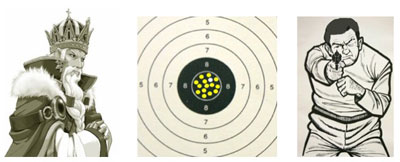 おそらくそれは、的と言えば、普通、中心一点に狙いを定めて射る様を想像するものですが、これはその逆で、技術的に折紙付きの名手に対し、的をバラバラにして撃つように仕向けている点、つまり、与えられた範囲内で、それぞれの弾をできるだけ離して撃ち込む、というところだと思います。