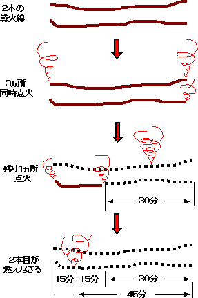当設問のやっかいなところは、導火線の材質が均一に出来ていないということからくるものです。一本の導火線を半分の半分、つまり4分の1に正確に折り曲げ、その一端に点火してから、ちょうど3番目の折り目、つまり3分の1が燃え尽きた時点で45分になるというのは、あくまで材質が均一の場合で、そのような小学生でも解ける設問であるはずはなく、またそうであれば導火線が2本も必要ありません。 2本あるということから、お互いを繋げて、あるいは重ねてみることも考えられますが、たとえば繋げた場合、燃え尽きるのに合計2時間になるだけの話で、それが1本1時間の場合と決定的に違う判断基準となるような題材なり、あるいはまた解答に至るヒントを提供してくれるわけでもなさそうで、問題の本質に何ら変わりはないようです。 またその2本を十字状に重ね合わせ、4つの端のうちの1つに火を点けてみたらどうか。この場合、2本が重なり合っている交点まで燃えて来ると、その交点で火は3方向に分かれて燃え進みますが、最初に火を点けた導火線の直進方向の1本が燃え尽きるまでは当然1時間ですが、それと交差しているもう1本の導火線の両端に火がそれぞれ到達する時間などは、たとえ交点がどこにあったとしても判断するすべもなく、どんなふうに重ね合わせるにしろ、何ら解答に迫るような糸口は見い出せません。